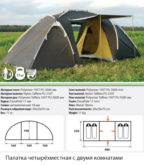 Кемпинговые палатки используются при отдыхе на природе. Такие палатки весьма вместительны, высота доходит до двух метров. В наличии имеются 2-х, 3-х, 4-х местные палатки. А также есть 4-х местные палатки с двумя комнатами.